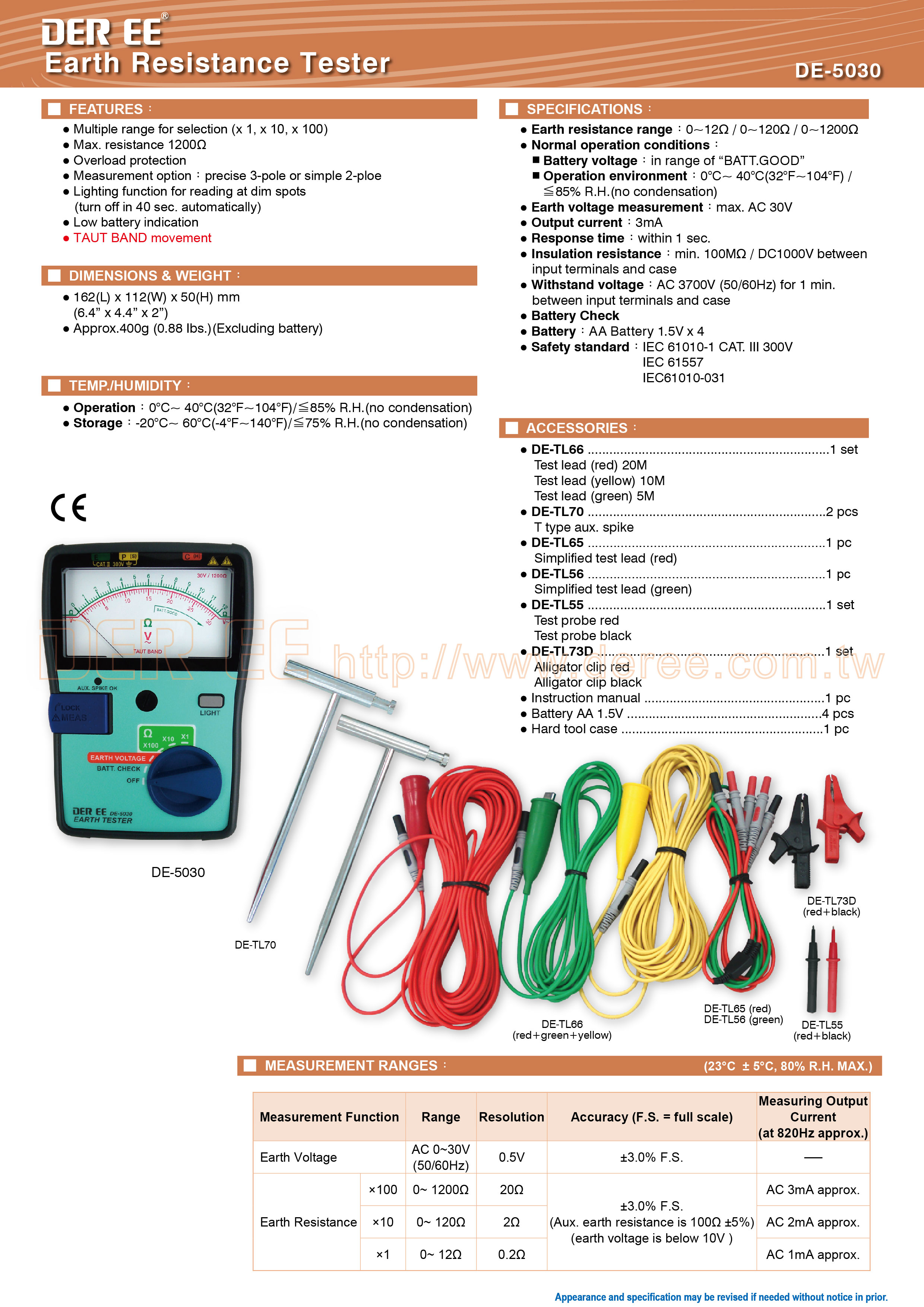 配备有配备taut band 表头,并以交流电压测量,0〜12Ω,0〜120Ω和0〜1200Ω的可选接地电阻范围,DER EE DE-5030接地电阻计是一可靠的工具,提供精确且易于操作的接地检查。